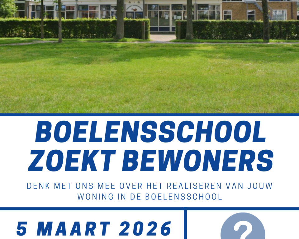 KOM JE OOK NAAR DE INLOOPBIJEENKOMST "BOELENSCHOOL ZOEKT BEWONERS" OP DONDERDAG 5 MAART?